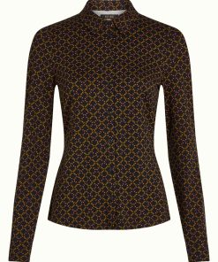 This blouse features a stretchy viscose jersey fabric with a graphic print, long sleeves finished with cuffs, a classic collar, and a button-down front for easy wear.