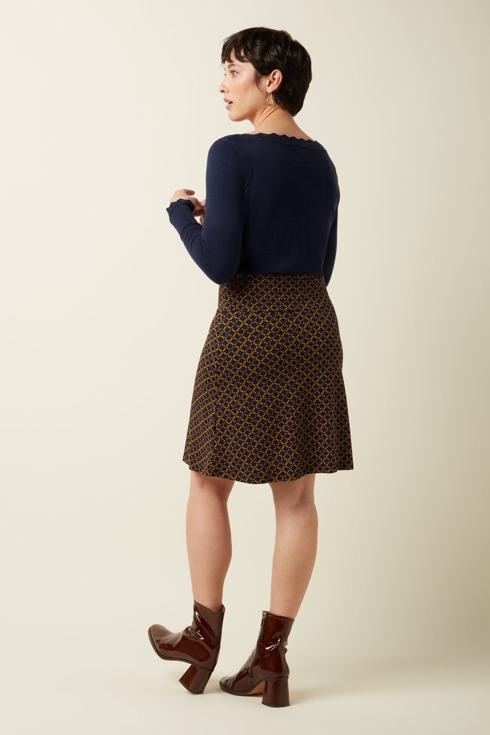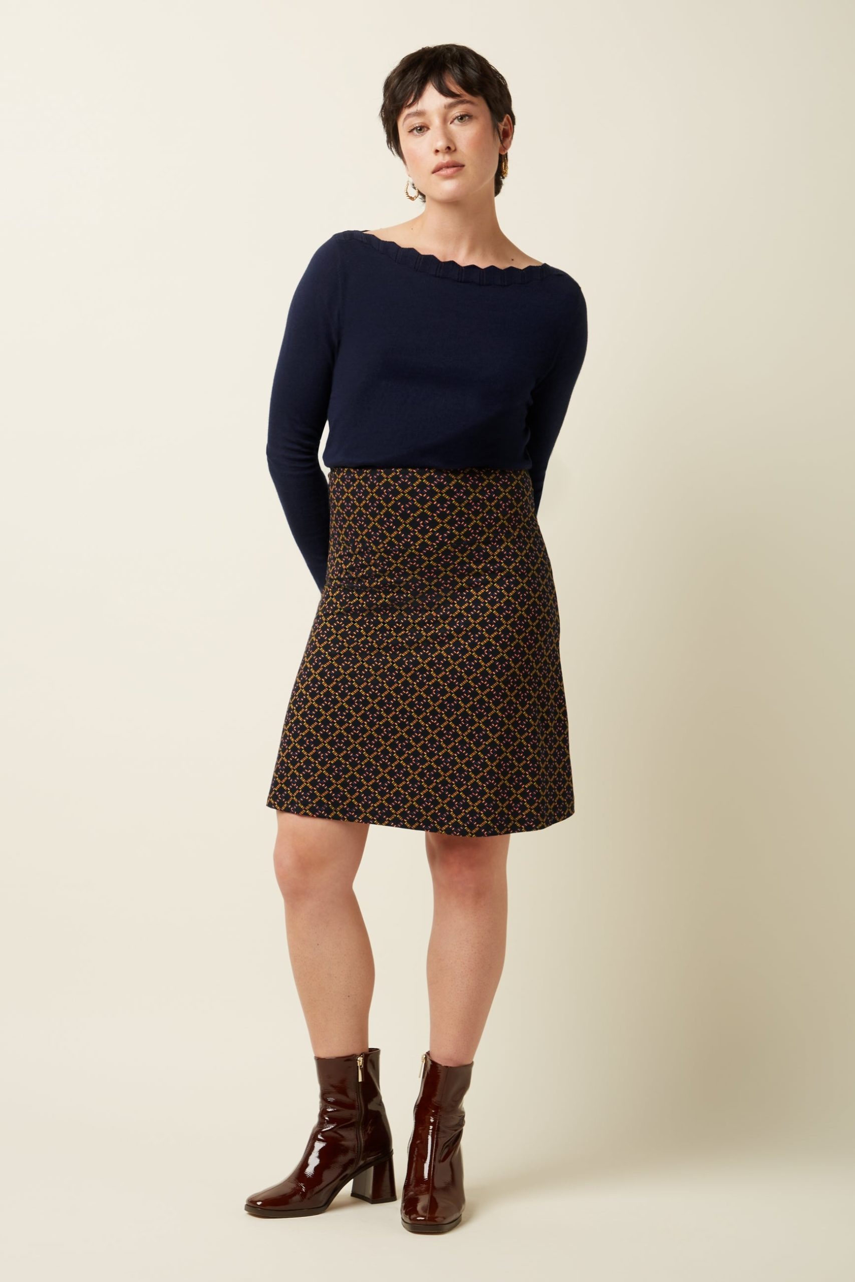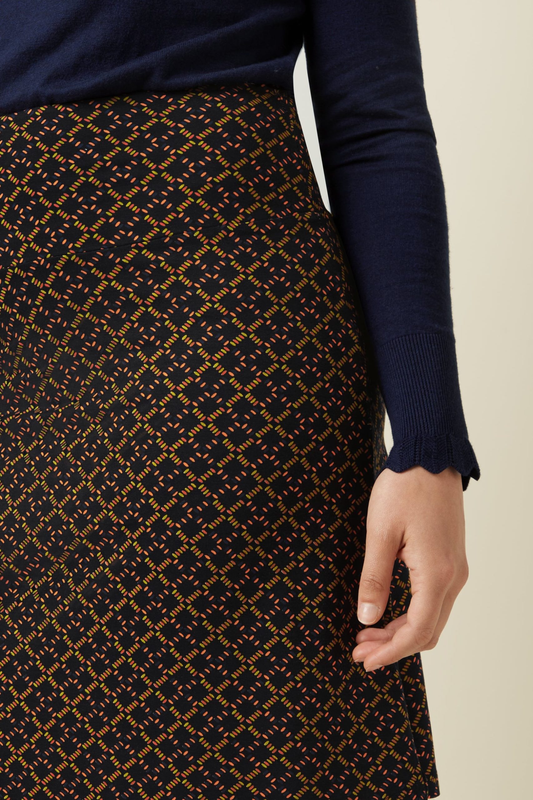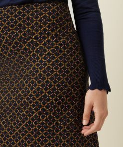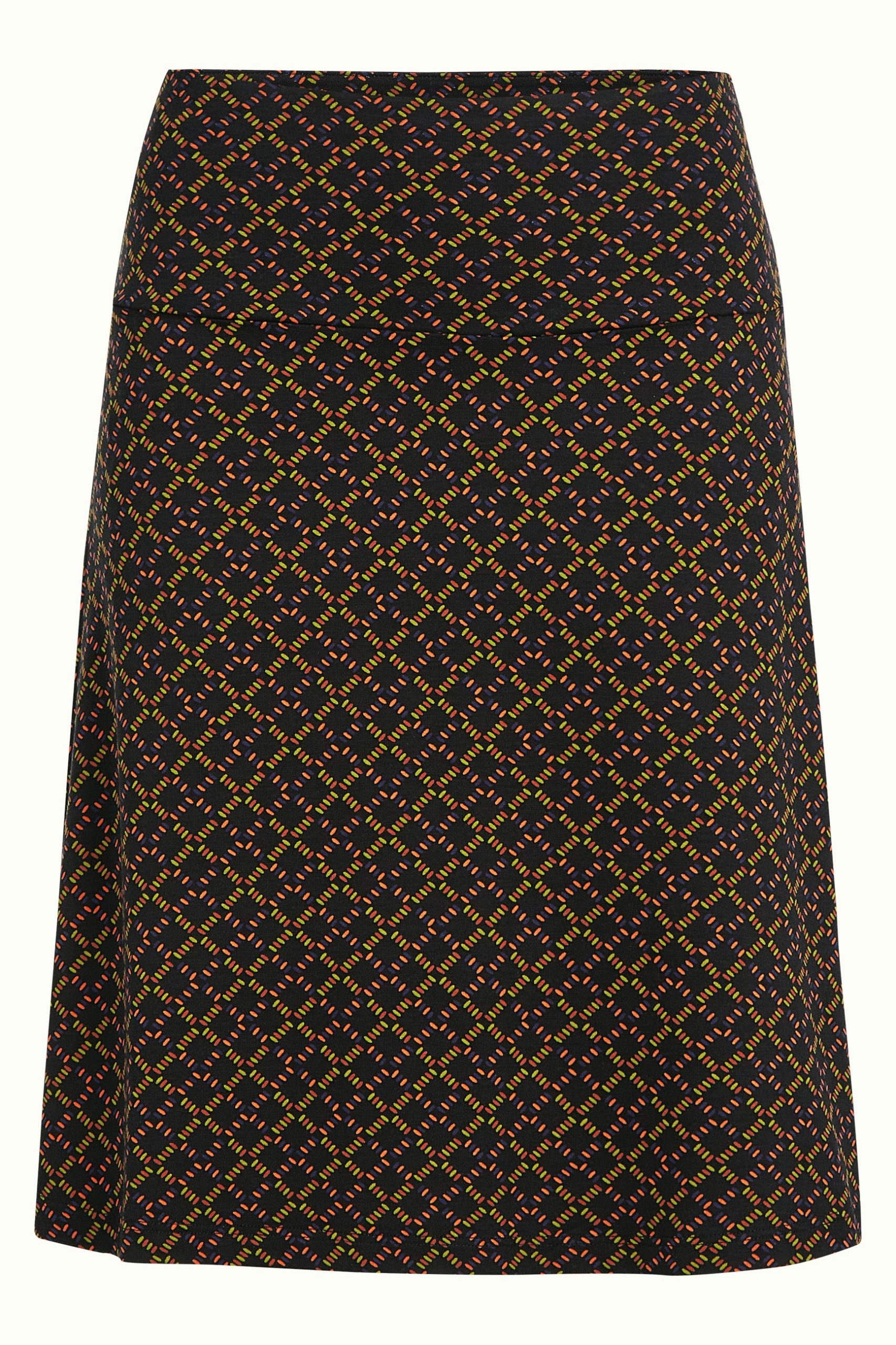 This knee-length A-line skirt features a wide elastic waistband for comfort and a graphic print on soft, stretchy viscose jersey fabric.