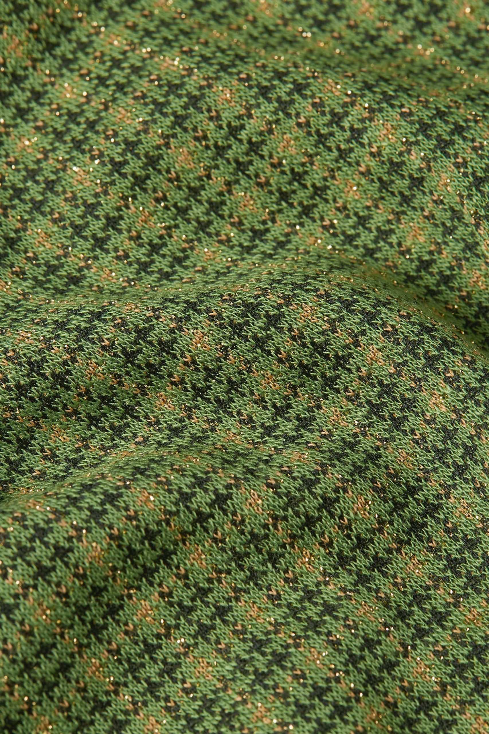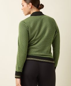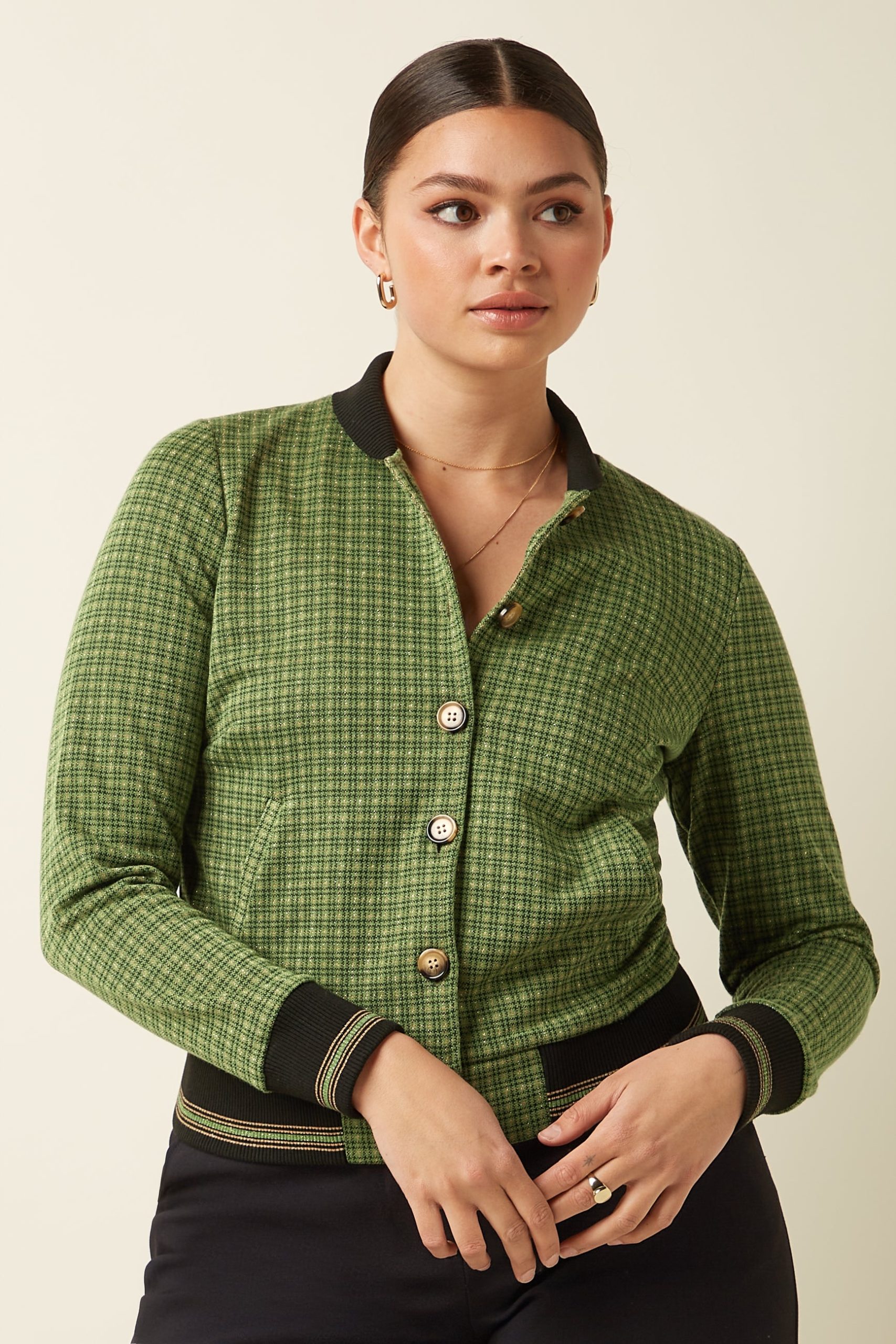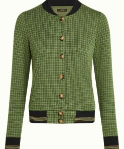 The Cleo Jacket Ivy Check combines sophistication with timeless style. Made from non-stretch knit jacquard, it features a glittering checkered print, long sleeves, and a knitted collar. Welt pockets and a button closure complete this elegant, polished look.