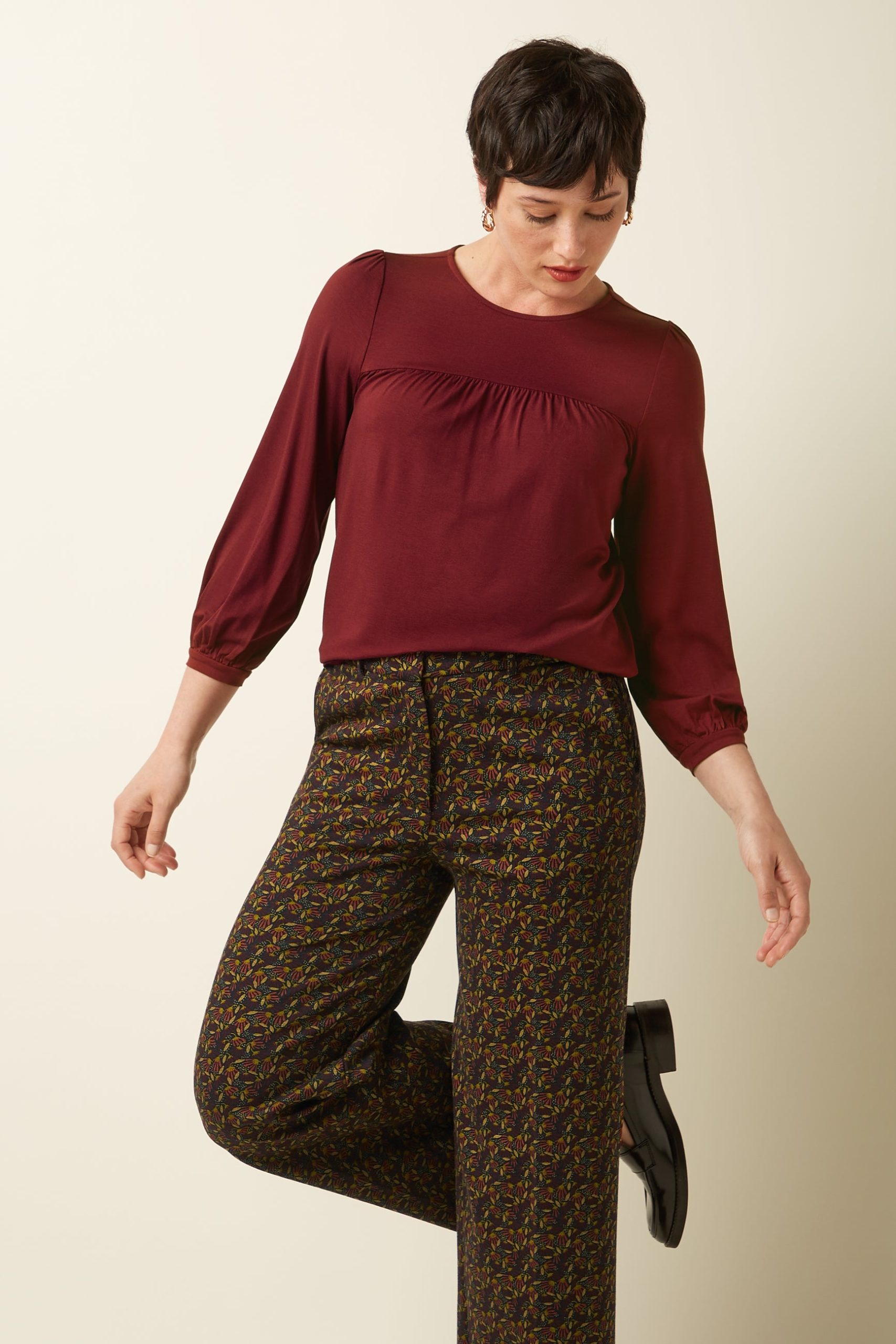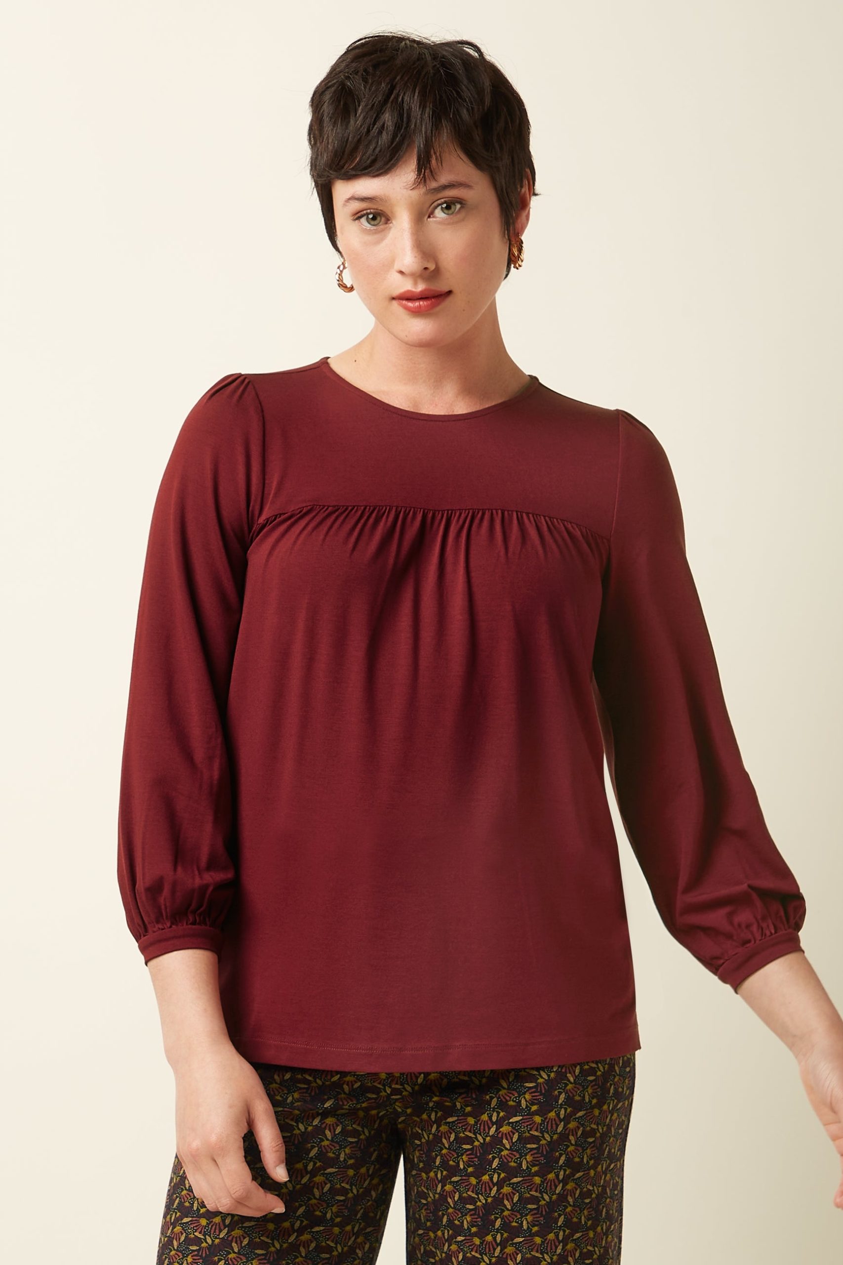The Luella Top Viscose Light offers delicate yoke pleats, 3/4 cuffed sleeves, and a round neckline with keyhole button, crafted from stretchy viscose jersey for comfort and style.