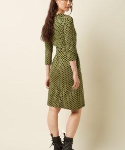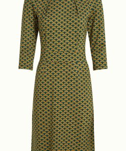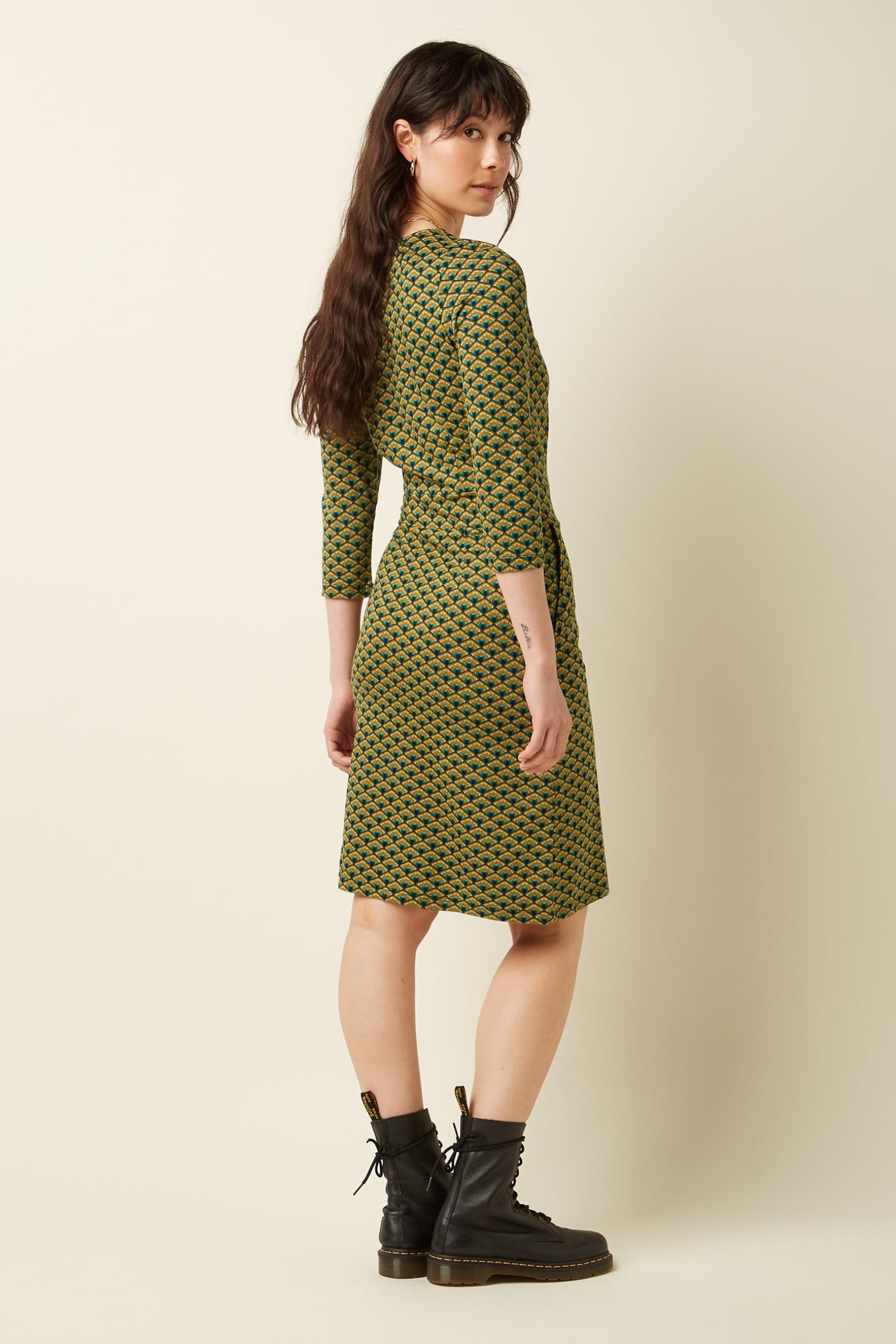 The Mona Dress Frio combines a fitted silhouette with a round pleated neckline, stretch viscose jersey, and a fixed waistband. Featuring 3/4 sleeves, side pockets, and a graphic print, it offers elegant style in a knee-length design.