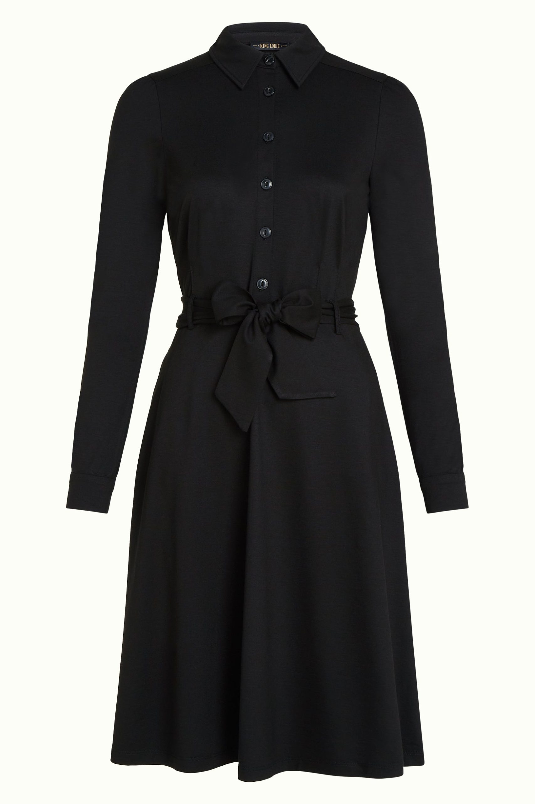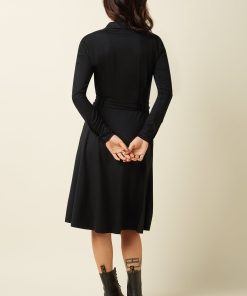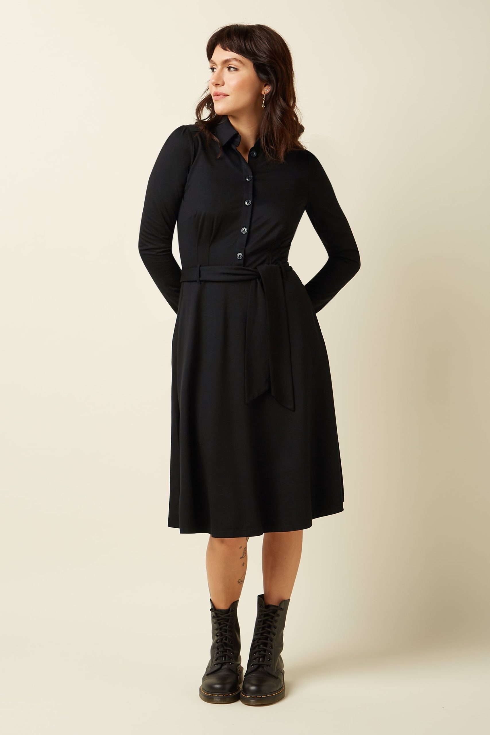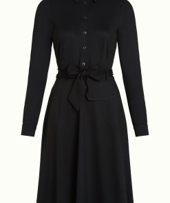 The Sheeva Dress Viscose Classic is a sophisticated shirt dress with a blouse collar, long cuffed sleeves, and a tie belt that defines its flared, knee-length silhouette. Crafted from stretchy viscose jersey, it features a refined button closure for elegant comfort.